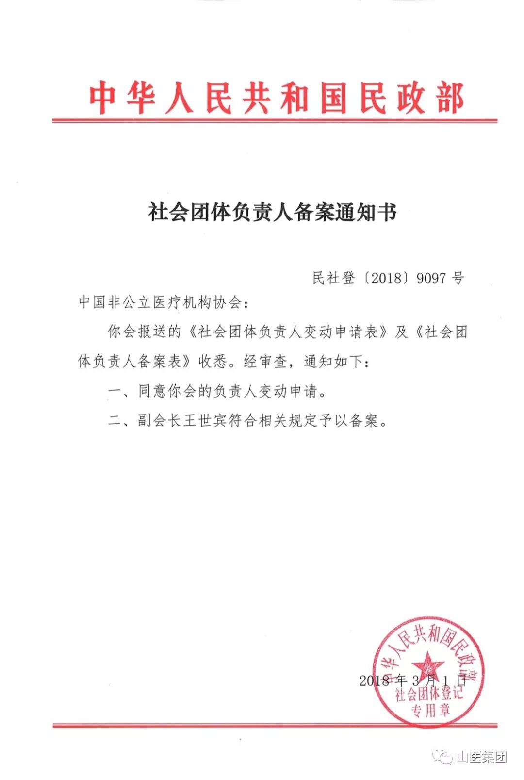 经中华人民共和国民政部备案批准:山医集团董事长王世宾任中国非公立医疗机构协会副会长